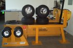 Extensively tested in our own facility and engineered with heavy duty components. The "drum” assembly comes with four independent high speed alloy wheels and road race "slick” tires, large spindles and free spinning dual bearings. Thick steel plating is cut to precise shapes on our 3 axis CNC plasma machine; fixtured, gusseted and MIG welded in place for strength. The front wheel “channel” is made from heavy duty steel with large footing plates for secure mounting. All finished in a durable yellow coating.